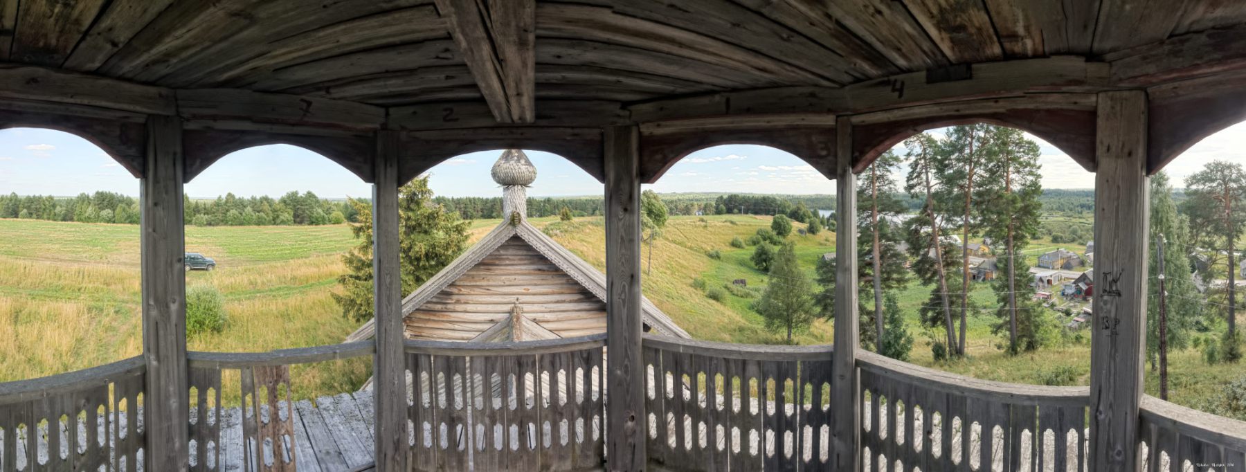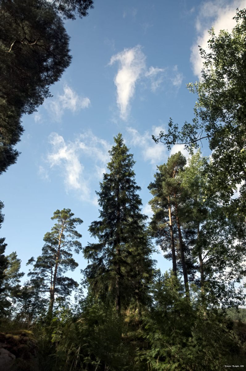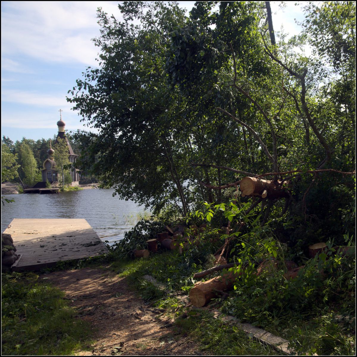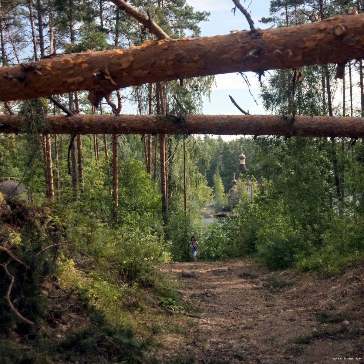 Утром вернулись по шоссе к парковке у начала тропы к парому, перевозящему на островок с храмом. Людей здесь не было, несмотря на выходной день, и паром стоял запертый. В лесу были хорошо видны следу недавней бури, но большинство упавших на тропу деревьев уже распилили и проход к берегу открылся.